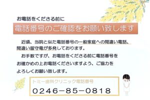 近頃、当院と電話番号が似た一般家庭への間違い電話、間違い留守番電話が多発しております。