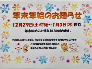 12月29日(土)の午後〜1月3日(木)まで、年末年始のお休みをいただきます。 ご迷惑をお掛けしますが、何卒ご了承下さいますようお願い申し上げます。m(_ _)m